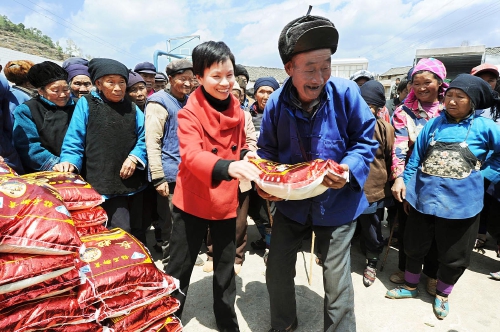 郑雪君(前排左)到云南旱灾重灾区向灾民发放救灾物资。王胜利/摄