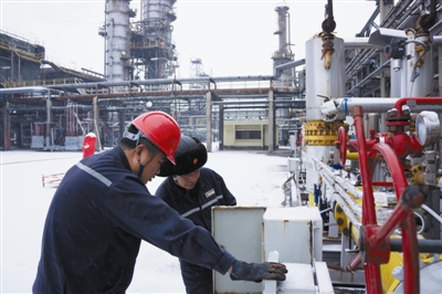 11月30日,抚顺地区大雪纷飞,气温骤降,抚顺石化公司所属各企业立即行动,一线员工积极清扫巡检路线,岗位人员除正常操作外,巡检时重点对机泵循环水温度、跨线、盲肠死角、回水盘疏水器、小径管、灭火器胶管、消防炮、消防栓、消防蒸汽、仪表箱门等重点防冻防凝部位进行检查,确保不冻坏一条管线一个阀门。王秋 摄