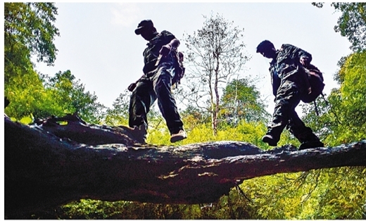 山里走着走着就没路了,队员们只能找好方向摸索着前进。