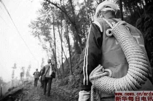 在四川峨眉山市,孤石危岩整治队的工人背着安全绳准备上山。新华社记者薛玉斌摄