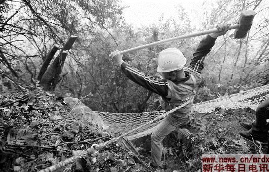 悬在铁路上方几百米处一块一吨多重的危岩,就是张贵洪和工友们这次要清理的目标。雨后的山路泥泞湿滑,陡峭的岩石难以立足。由于作业面狭窄,每一次举起32磅锤,队员都可能跌落山崖。为安全起见,工人除了拴牢背上的安全绳,还要绕岩石外围拉上防护网。于是就有了开头的惊险一幕。