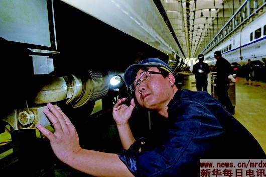 春运期间,南昌铁路局福州动车段每天承担104.5对次动车组的检修任务,为确保动车开行安全,福州动车段611名地勤机械师日夜坚守,默默奉献。新华社记者张国俊摄