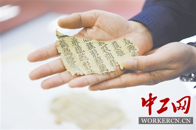 修复师向记者展示即将修复的一页西夏文古籍,据估测距今有500多年的历史。