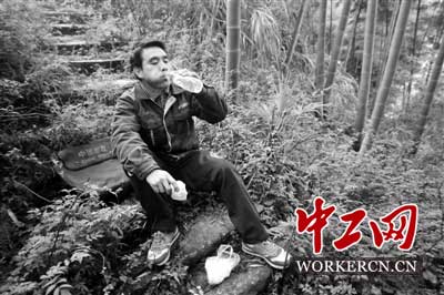 3月25日,邮递员邓六林在江西省南昌湾里区梅岭大山中吃东西休息。