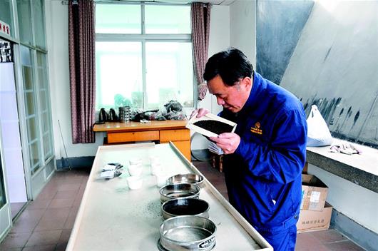 湖北省赵李桥茶厂有限责任公司检验室内,59岁的甘多平将青褐色砖茶原料倒入评茶盘内,缓缓摇动后,仔细端详、细嗅香气,“颗粒匀、香气正,这批原料不错。”