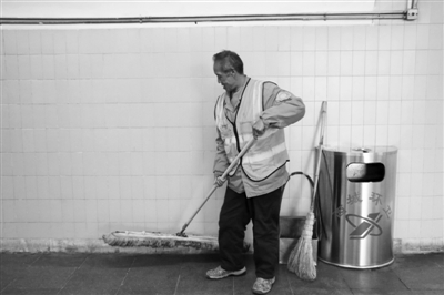 “只要你想干,总有干不完的活儿。”拖地板、擦垃圾桶、擦栏杆、……地下通道铺的是红色地板。“这种地板见土就显脏,拖地的时候要使更大的力气”。一遍下来,他的脸上总是汗涔涔。