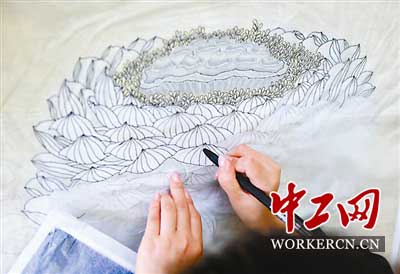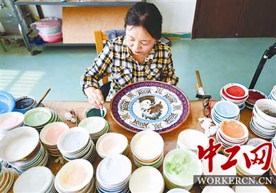 在北京工美集团技术中心,56岁的资深点蓝师傅李霞聚精会神地为一件精美的景泰蓝大盘上色。 “颜色深浅、明暗过渡,差别就在毫厘之间,全靠眼睛和手上功夫拿捏分寸。”