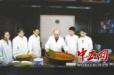 4月28日,胡庆余堂老药工丁光明向徒弟们传授手工泛丸方法。 新华社发