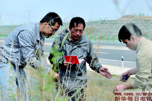 ▲在腾格里沙漠西南边缘一高速公路边建成的尼龙网治沙方格护坡上,中科院西北生态环境资源研究院研究员屈建军(中)在与团队成员测量沙生植被生长状况(5月10日摄)。新华社记者郭刚摄