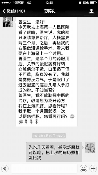 自从与曾医生成为微信好友,刘阿姨记不清深夜里微信“骚扰”过曾医生多少次,她只知道,不管多晚曾医生每次都是有问必有答。最让刘阿姨感动的是,曾医生清楚地记着她的复诊时间,每次都会提前两三天发个微信提醒;自己有事不能坐诊,也会发个微信告知;每一次的化验指标,曾医生记的比自己这个当事人还清楚;只要说出哪里不舒服,下次看诊时曾医生一定会想办法解决。