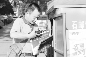 ■揽投员不畏酷暑送快件。本报记者 张海强 摄