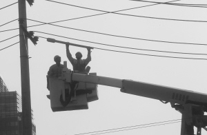 ■电力工人在高温下作业。本报首席记者 李青 摄