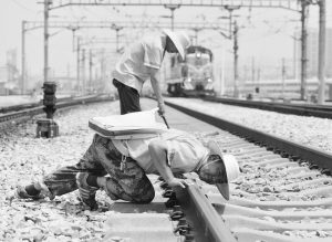 ■敬业的铁路维修工。本报记者 张海强 摄