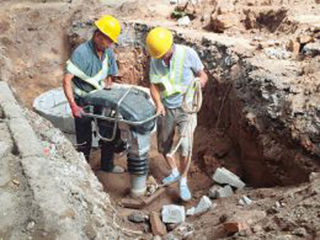 7月17日,市政工人在省城气化街东段挖掘沟槽。铺设沥青温度不低于120℃ 本报记者 丁园摄