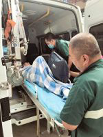 郝春续、孙国强将患者抬到急救车上。车内温度60℃ 采薇 摄