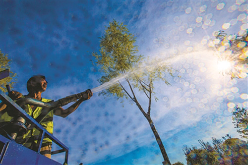 每天下午四点开始,一直持续到深夜,每天要浇40多吨的水。宋峤 摄