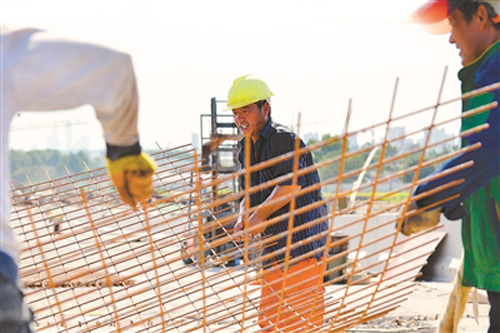 7月18日,南京纬七路东进二期工程现场,建筑工人顶着烈日进行桥面施工。万程鹏 摄