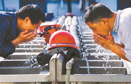 高温下的劳动者,汗水湿透衣襟,他们用自来水冲洗一下,继续工作。刘莉 摄
