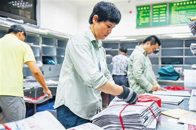 周沛娟出发前将要送的报纸按地址顺序进行归类。