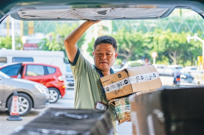 ⬅到达投递点后,蔡夫彬从车上卸下快件,准备投递。