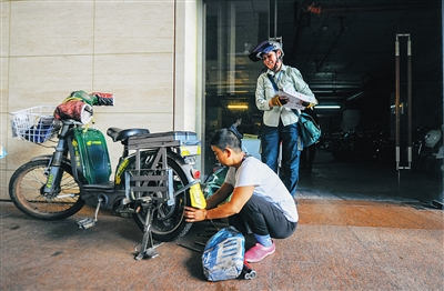 在投递途中,周沛娟的车胎漏气了,她只能暂时放下手头的工作。