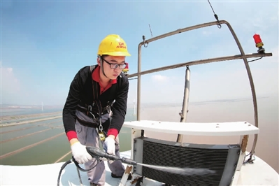 “大风车吱呀吱哟哟地转,这里的风景呀真好看。天好看,地好看,还有一群快乐的小伙伴。”这儿歌就好似为徐超林他们写的。负责着这方圆5.2平方公里风电场的运行、维护、管理的,只有徐超林他们6人。这些平均33岁的年轻人一年四季坚守在风机之巅,成了“驭风人”,每天迎着朝霞、伴着落日在80米的高空行走作业,精心呵护风机的安全稳定运行。难吗?记者在徐超林指导下,系好10余公斤的安全带体验登风机。