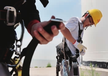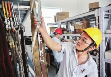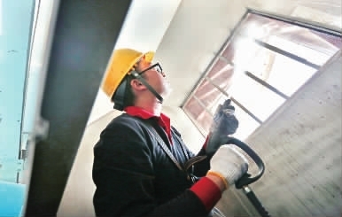 “如今登风机有‘电梯’啦!”徐超林很满足。这所谓电梯只是个不到50厘米见方的踏板,2016年企业负责人特地为职工安装的风机专用免爬器。这个电动设备就置于风机内部的垂直爬梯上,作业人员需要头戴安全帽、身着厚工装、安全带及检修工具站上踏板,双手控制操纵杆登塔。风机高大,但内部直径不足3米的塔身狭窄幽深,每隔10几米才有盏灯照明。通过风机连接处时尤其紧张,由于有巨大法兰的突起,身材较瘦小的记者也只能紧贴操作杆才得以通过,稍不留意,安全帽就会因碰到巨大的螺丝钉而发出清脆的碰撞声。“我们刚入行时,需要过的首道关就是徒手爬梯。240多阶直梯,每天上下10多回,得比猴子灵活才算过关!”徐超林笑了。