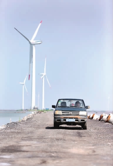 天天与风机为伴,工作条件艰苦非常,但当清洗机舱外部油泥的李剑钻出机舱顶时,那天高、云淡的壮美景象还是促使其系好安全绳后,掏出手机递过来:“来,帮我‘咔嚓’一张!”这也是工作小情趣。远离了繁华城市的日子是枯燥的,但小伙子们能自寻乐趣。“我们能上网、可健身,单位还给我们宿舍配了电视,闲时还能跟同事们打打牌。”徐超林指着离11号风机不远的一个当地村民们自家虾塘盘算着,“这些虾个头大、无公害,但只够附近村民吃,在外头市场上可买不到!”说到这,他那张黝黑面庞上透出一丝调皮来。