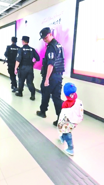 “爸爸,爸爸!”前天下午,在地铁2号线中山公园站,一个小男孩蹒跚地跟着正在执勤的特警后面(左图),不住地喊着。男孩名叫陈丁诺,他的爸爸是市公安局特警支队江北机动大队民警陈祖明,因为工作,他已经5天没有见到儿子了。