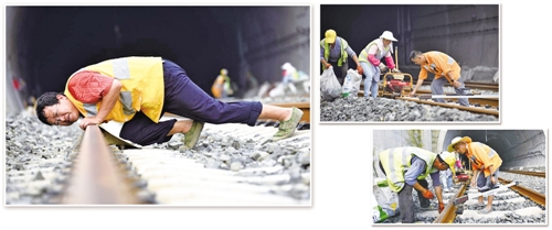 图③ 改道作业一组的员工在精调轨道后实行二次检查。