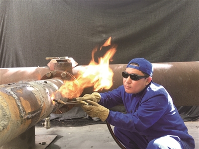 张海军从事焊工24年,能取得如此大的成绩,与他良好的基本功是分不开的。“最初我焊接的管道内没有燃气,后来逐步接触带气作业,刚开始看见管道上闪烁的火苗,我也比较胆怯。”后来,张海军通过刻苦磨练克服了恐惧,并逐步成长为行业内的高手。一般在切割和抹泥灭火的环节,需要两个人配合进行,但因为有些作业坑条件不够,张海军便把自己锻炼成了多工种“战士”,一个人进行多项操作。