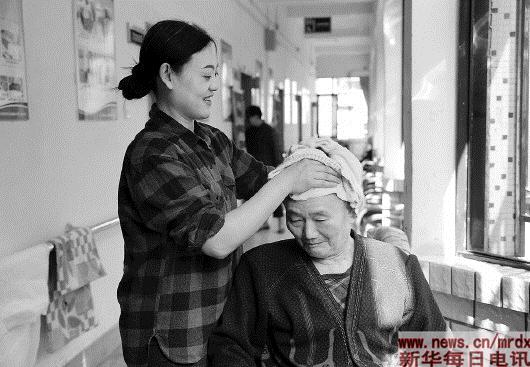 ▲王玉在福利院为中风瘫痪的父亲洗头(4月30日摄)。 新华社发