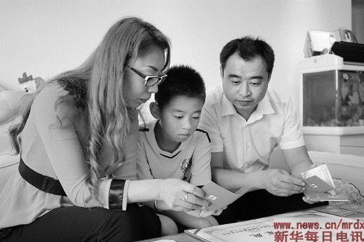 ▲夫妻俩向儿子讲述每一本献血证背后的故事 新华社记者徐祥达摄