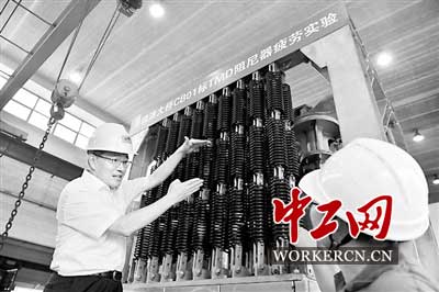 2017年9月7日,济南, 海归博士尹学军在实验车间和同事探讨港珠澳大桥TMD阻尼器疲劳实验结果在实践中的应用。