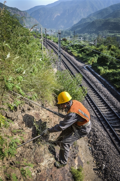 50多岁的朱印是扫山班的老班长,在铁路上工作几十年了,“扫山”是他干得最久的工作。“扫山是技术活,要攀爬高山,也要悬挂于峭壁之上,不是光靠胆子大就行的。”朱印告诉记者,攀岩技巧、安全作业规范,都是确保顺利完成工作不可或缺的技能。