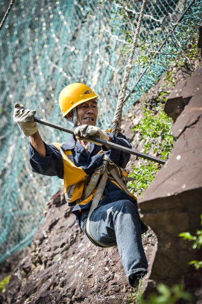 十几米峭壁,工人一手握着撬棍,一手掌握悬挂的平衡,熟练地剔除峭壁上松动的岩石。