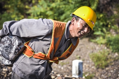 敲碎和运输数百斤的石头,扫山工们要用肩挑、背扛来完成。