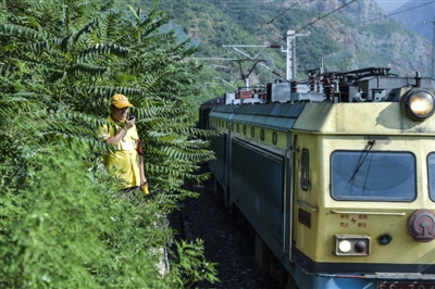 9月8日下午两点,记者驱车穿过蜿蜒的盘山路,来到门头沟山区内的一处丰沙铁路沿线,见到了正在那里忙碌着的“扫山工”,他们来自北京铁路局北京西工务段门头沟桥梁车间。