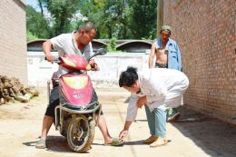 在村口查看脚趾被砸伤村民的恢复情况。