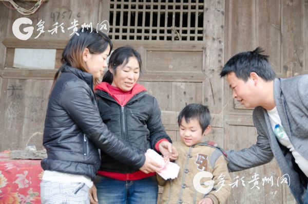 周廷猛(右一)将爱心人士的捐款送到贫困生家中(受访者供图)