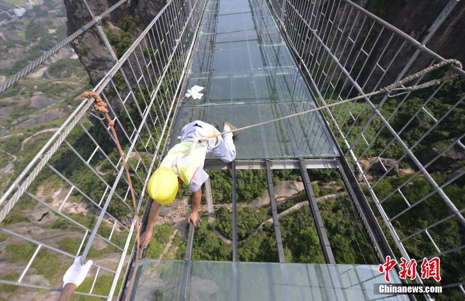 9月18日,在湖南平江某景点180米高空上,4名玻璃桥维修工人头顶烈日,正在对景区内的全透明高空玻璃桥进行大型全面检测、安全维护及更换玻璃等工作,以此备战即将到来的国庆中秋假期。杨华峰摄