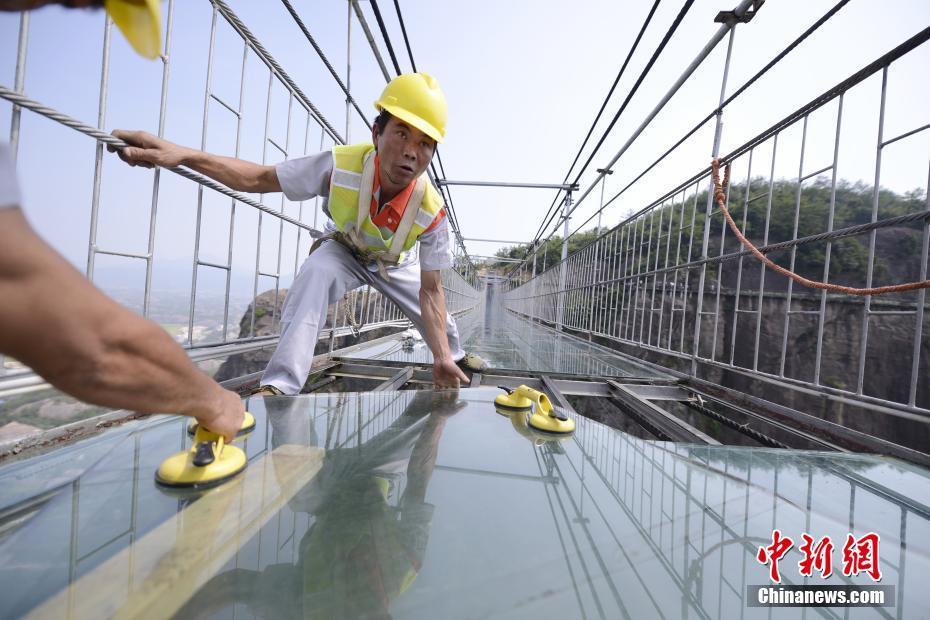 工人180米高空为透明玻璃桥换玻璃