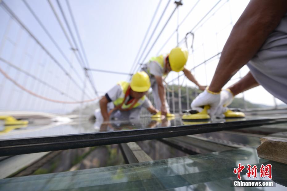 工人180米高空为透明玻璃桥换玻璃