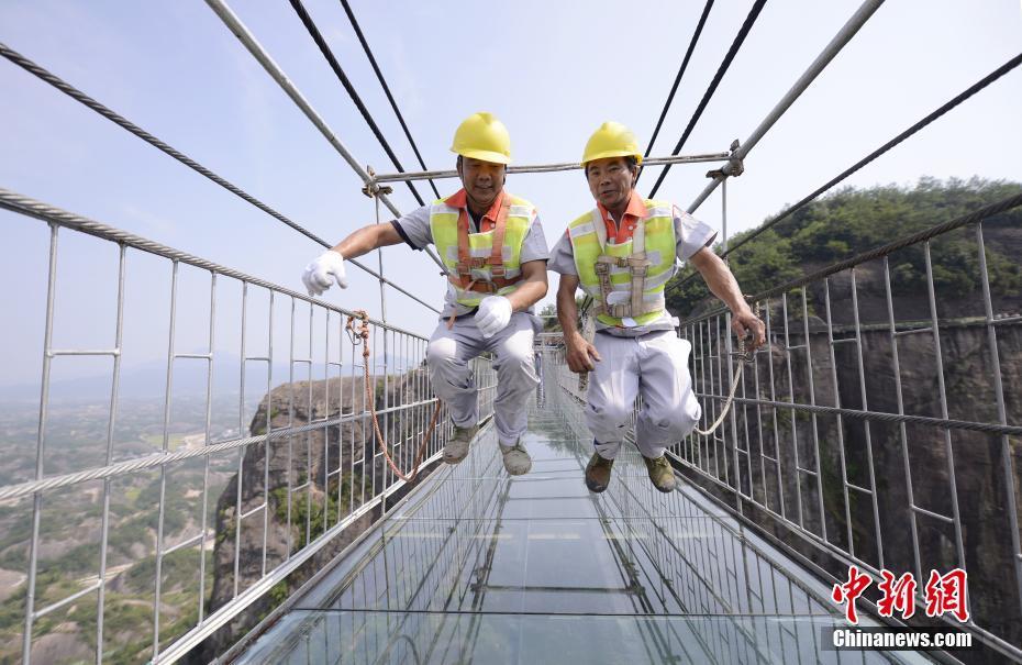 更换完成后,维修工人在玻璃桥上跳跃检测玻璃与钢筋的抗压性。