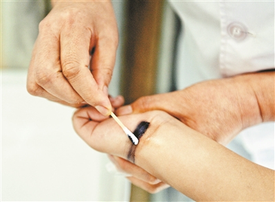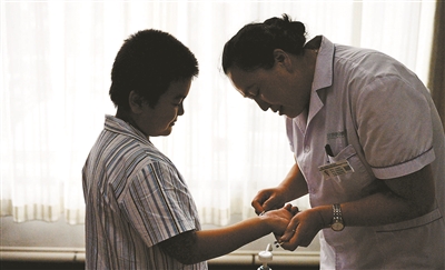 9月26日下午,北京青年报记者在医院见到了穿着病号服,正等待涂药的江乐,江乐个子不高,但身体很壮实,性格腼腆又带着点调皮。江乐来自河北保定,目前在读四年级。