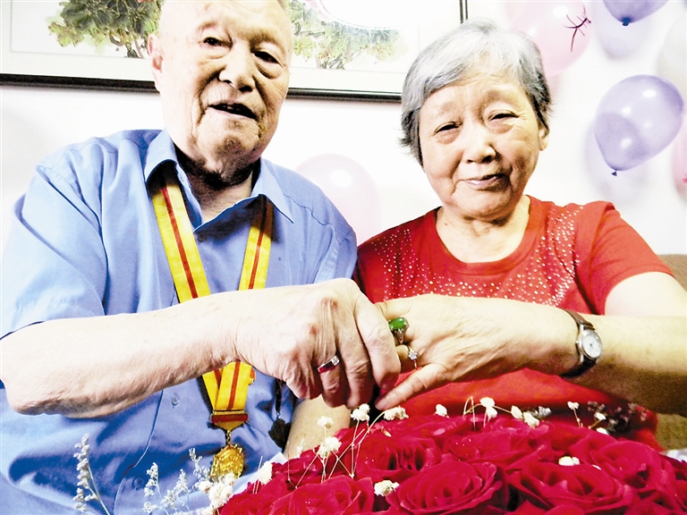 本报讯 昨天上午,河东区东盈园社区居委会和河东区疾病预防控制中心的志愿者来到老夫妻杨登阁、李雯的家中。在大家的祝福声中,89岁的杨登阁为老伴儿戴上戒指,温馨相拥。