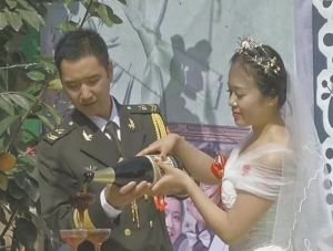10月6日,邯郸市曲周县大河道乡西河道村,一场充满喜庆与浪漫的婚礼在这里热闹举行。新郎贾志新和新娘李晓利在亲朋的帮助下,简单布置了婚礼现场。新郎身着橄榄绿军装放开歌喉向新娘表达浓浓的爱意,在亲朋好友的欢呼声和祝福声中,温柔贤惠的新娘缓缓走上前,新郎将一枚小小的弹壳磨制的戒指戴到了新娘手上,二人手牵手一起迈向幸福的婚姻殿堂……