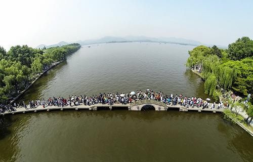 图为,5月1日,杭州西湖景区里的游客熙熙攘攘。图片来源,新华社。