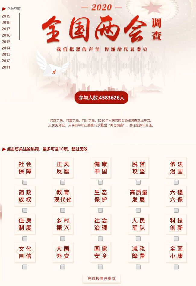 人民网今年全国两会调查页面。图片来源:人民网截图