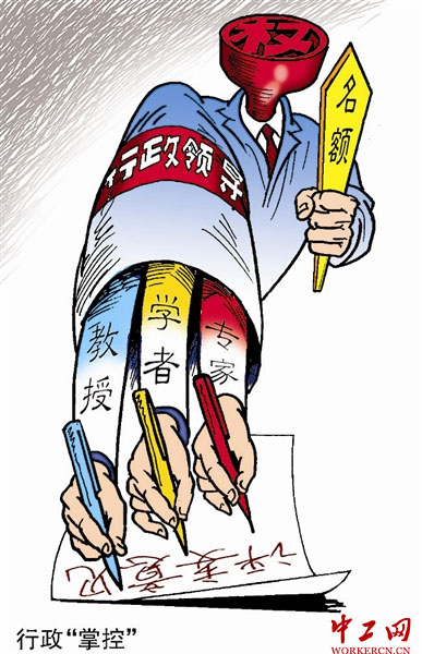 参与过多次评委工作之后,宋涛教授越来越有一种“被绑架”的感觉。宋涛感觉,评审看似都由专家来完成,但实际上最重要的事情都是按照行政化规则进行。宋涛认为,签字的都是学者,行政人员没有在任何一个环节签字,但这一切无法遮蔽行政化主导的“指挥棒”,简单化、指标化对待教育,而专业的学术评价则被淡化,“行政权力干扰了学术权力”。(8月19日《中国青年报》)